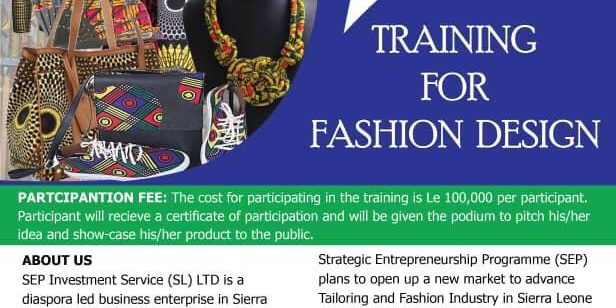 Training for 50 fashion designers PARTCIPANTION FEE: The cost for participating in the training is Le 100,000 per participant. Participant will recieve a certificate of participation and will be given the podium to pitch his/her idea and show-case his/her product to the public. Share this post Share on FacebookShare on Facebook Share on XShare on X Share on WhatsAppShare on WhatsApp Share on LinkedInShare on LinkedIn Author: admin Post navigationPreviousPrevious post:SnapMeNextNext post:Entrepreneurship Training in Sierra LeoneRelated StoriesSEP Talent Hub in Sierra Leone volledig voorzien van zonne-energieDecember 10, 2025Pump it up! Better water pumps in Sierra Leone!May 16, 2024SEP Creative HubFebruary 21, 2024Fashionomics lifts up Sierra LeoneNovember 1, 2022Discover the world, develop yourselfApril 18, 2022SEP sewing workshop/TalentHub walls but no roof yetApril 18, 2022